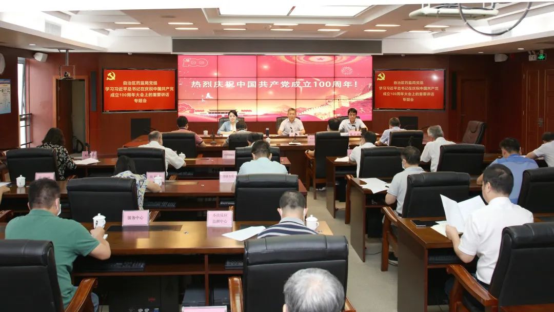 7月1日上午,庆祝中国共产党成立100周年大会结束后,澳门赌场官网 迅速召开党组中心组扩大会议,专题学习习近平总书记在大会上的重要讲话精神,强调要把习近平总书记重要讲话精神学习好、宣传好、贯彻好,在全区药品监管部门掀起学习热潮,充分展现新时代新征程中广西药监人的新担当和新作为。局党组书记、局长黄琛主持会议并发言。局党组成员、副局长韦广辉、万秋出席会议。