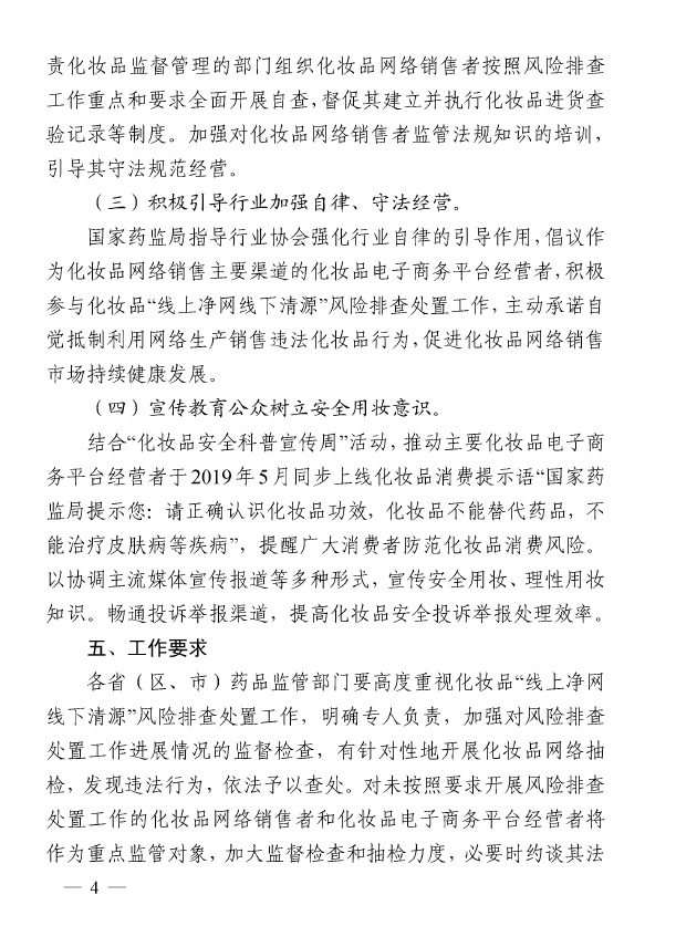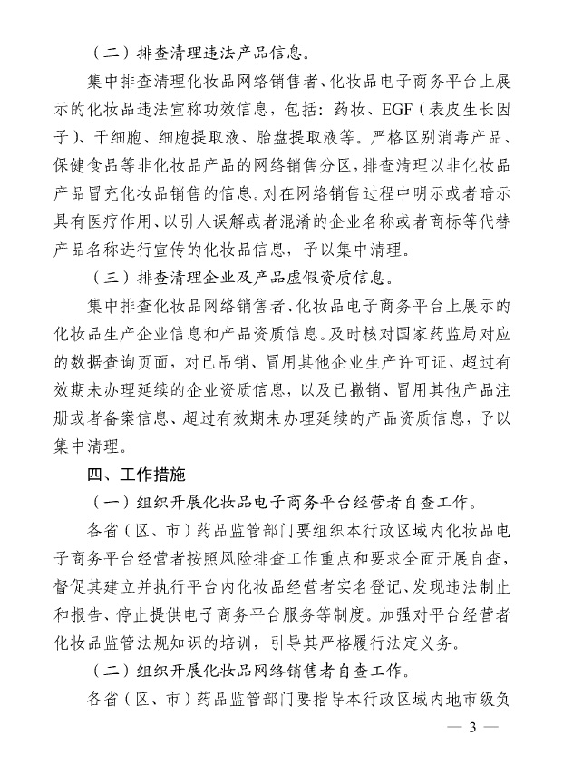 各市市场监督管理局要结合本地实际情况,采取一系列有效措施,组织开展化妆品电子商务平台经营者自查工作,组织开展化妆品网络销售者自查工作,积极引导行业加强自律、守法经营,宣传教育公众树立安全用妆意识。确保排查清理违法产品、排查清理违法产品信息和排查清理企业及产品虚假资质信息三项重点工作落实到位。同时,有针对性地开展化妆品网络抽检,发现违法行为,依法查处。对未按照要求开展风险排查处置工作的化妆品网络销售者和化妆品电子商务平台经营者将作为重点监管对象,加大监督检查和抽检力度,必要时约谈其法定代表人或者主要负责人,对发现的违法行为,依法从严查处。