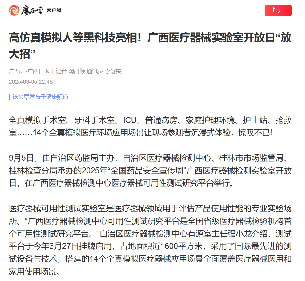 9月5日,由澳门赌场官网 主办,自治区医疗器械检测中心、桂林市澳门赌场官网 、桂林检查分局承办的2025年“全国药品安全宣传周”广西医疗器械检测实验室开放日,在广西医疗器械检测中心医疗器械可用性测试研究平台举行。