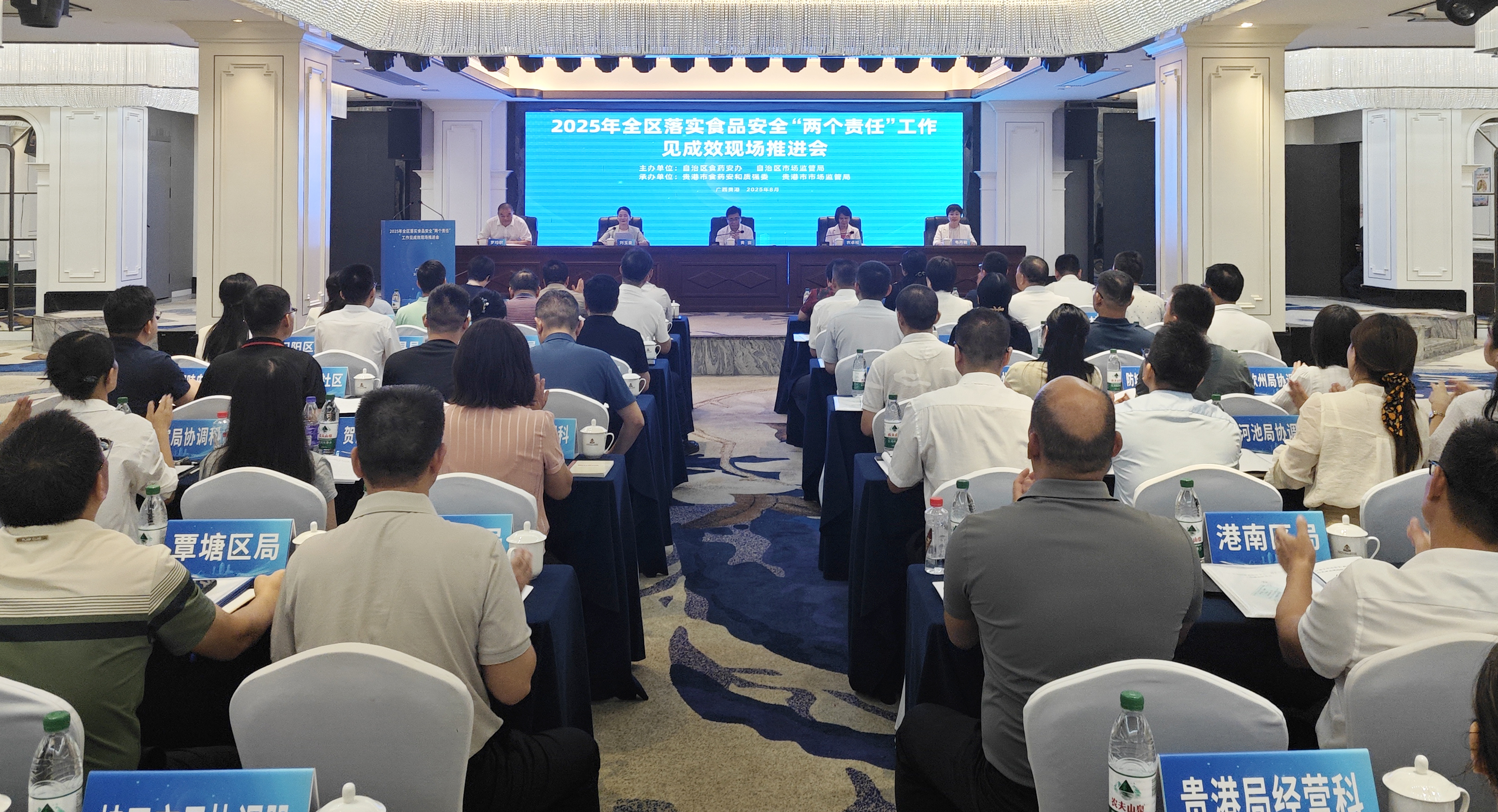 8月26日,2025年全区落实食品安全“两个责任”工作见成效现场推进会在贵港召开。会议贯彻落实党中央和自治区关于食品安全工作的决策部署,总结全区“两个责任”工作成效,分析问题隐患,统一思想认识、明确目标任务,部署推进下一阶段工作。自治区食药安办常务副主任、自治区澳门赌场官网 党组成员、副局长、一级巡视员黄震同志出席会议并讲话,贵港市人民政府副市长农卓松出席会议并致辞。