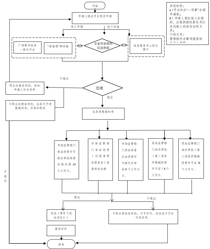 (二)办理方式。线上办理,依托广西数字政务一体化平台实现网上办理,通过在“高效办成一件事”专区设置“开办药店‘一件事’”申报入口,采用“一口告知、一窗受理、一表申请、一套材料、一网通办、一次办好”智能化方式集成服务,实现“网上办”“掌上办”。线下依托各级政务服务中心综合服务窗口,对“一件事”实行“一窗受理、一次办结”的工作模式,同时积极推行导办帮办、预约快办等便民服务手段。