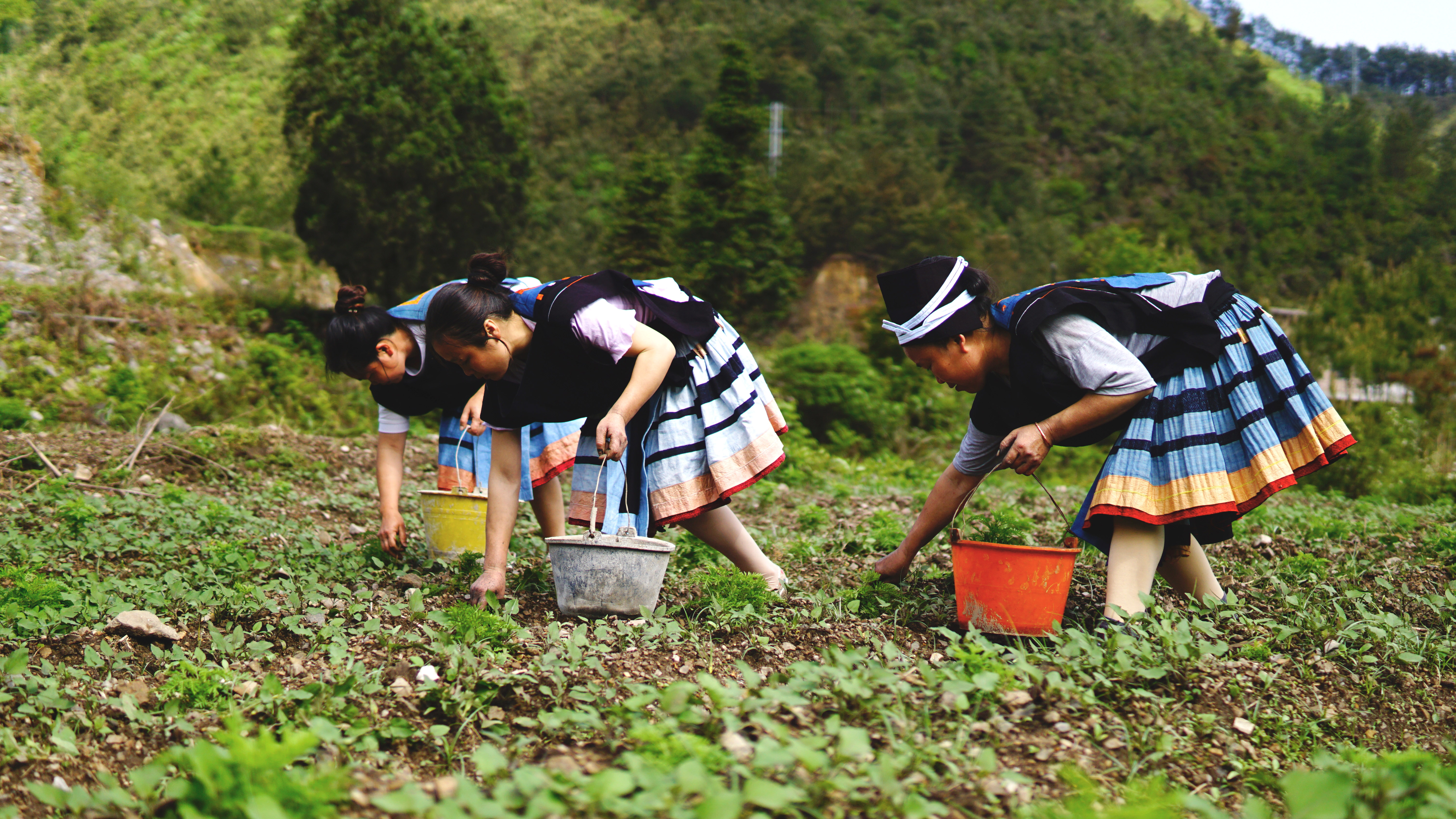 在田地里,一小撮一小撮银灰色的化肥从白裤瑶群众的手中洒下,落在青蒿株不远处变成养分。大家来回穿梭,现场洋溢着喜悦的气氛。